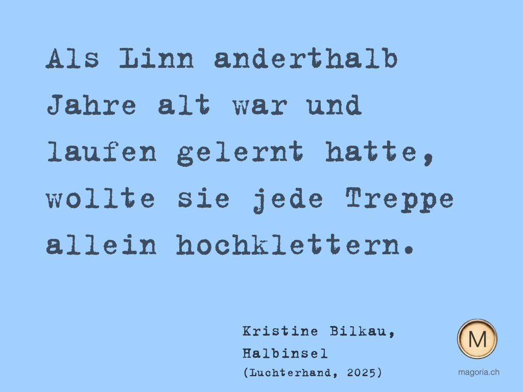 Für Kristine Bilkaus Roman Halbinsel trifft das eindeutig zu. Wir hören die Stimme einer fürsorglichen Mutter. Wenn die Geschichte im zweiten Absatz in eine andere Gegenwart springt, erfahren wir, was aus dieser Besorgtheit wird, wenn die Tochter auf eigenen Beinen steht. Die Stimme der Mutter trägt uns durch den Text, aber auf beeindruckende Weise lässt uns die Autorin an zwei gleich starken Perspektiven teilhaben, ohne uns in die eine oder die andere Richtung zu ziehen.